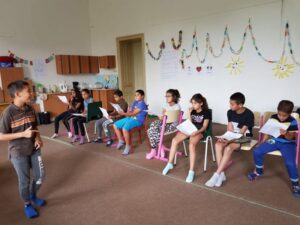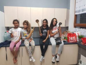 Na táboře si to děti užívali ale taky pomáhali. V kuchyni se střídali, každé dítě mělo možnost si zkusit kulinářské umění 🙂 Větší děti (děvčata)