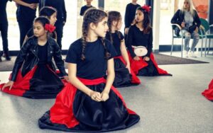Taneční vystoupení v rámci prohlídky Archeoparku .